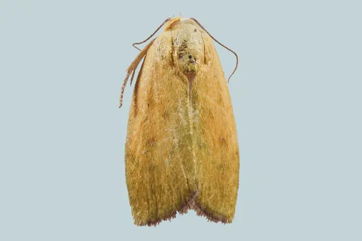 泰山大钻瘤蛾翅展约25毫米,前翅呈温润的黄绿色,肾纹为一红褐色模糊小点晕染其上,外侧一道浅绿色弧形横线,与翅外缘的淡绿边线相呼应,缘毛基部呈暗紫色,为整体黄绿基调增添了一抹别致色彩。